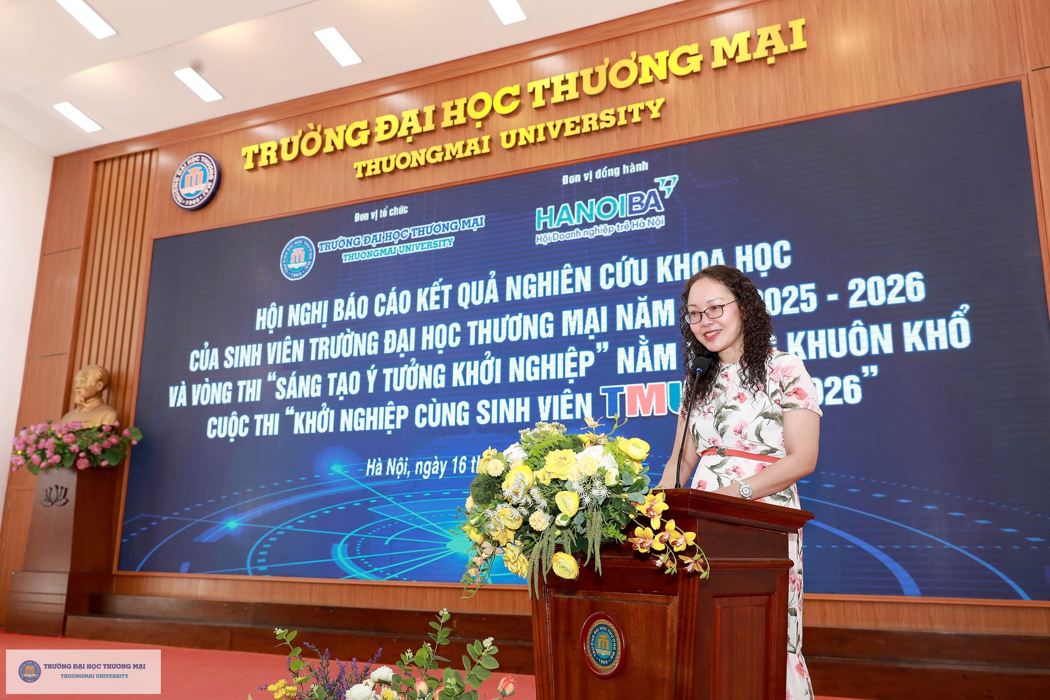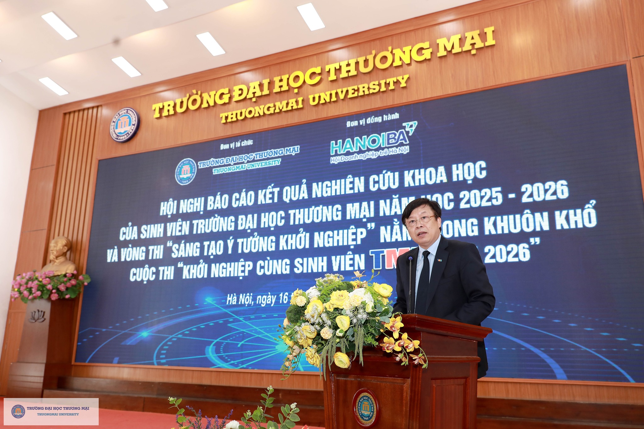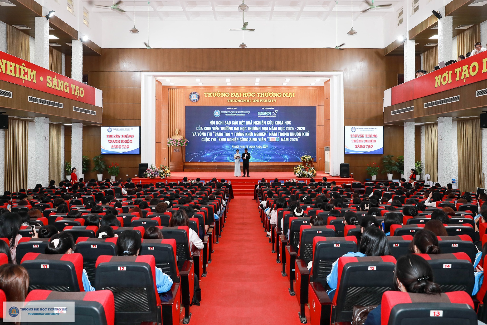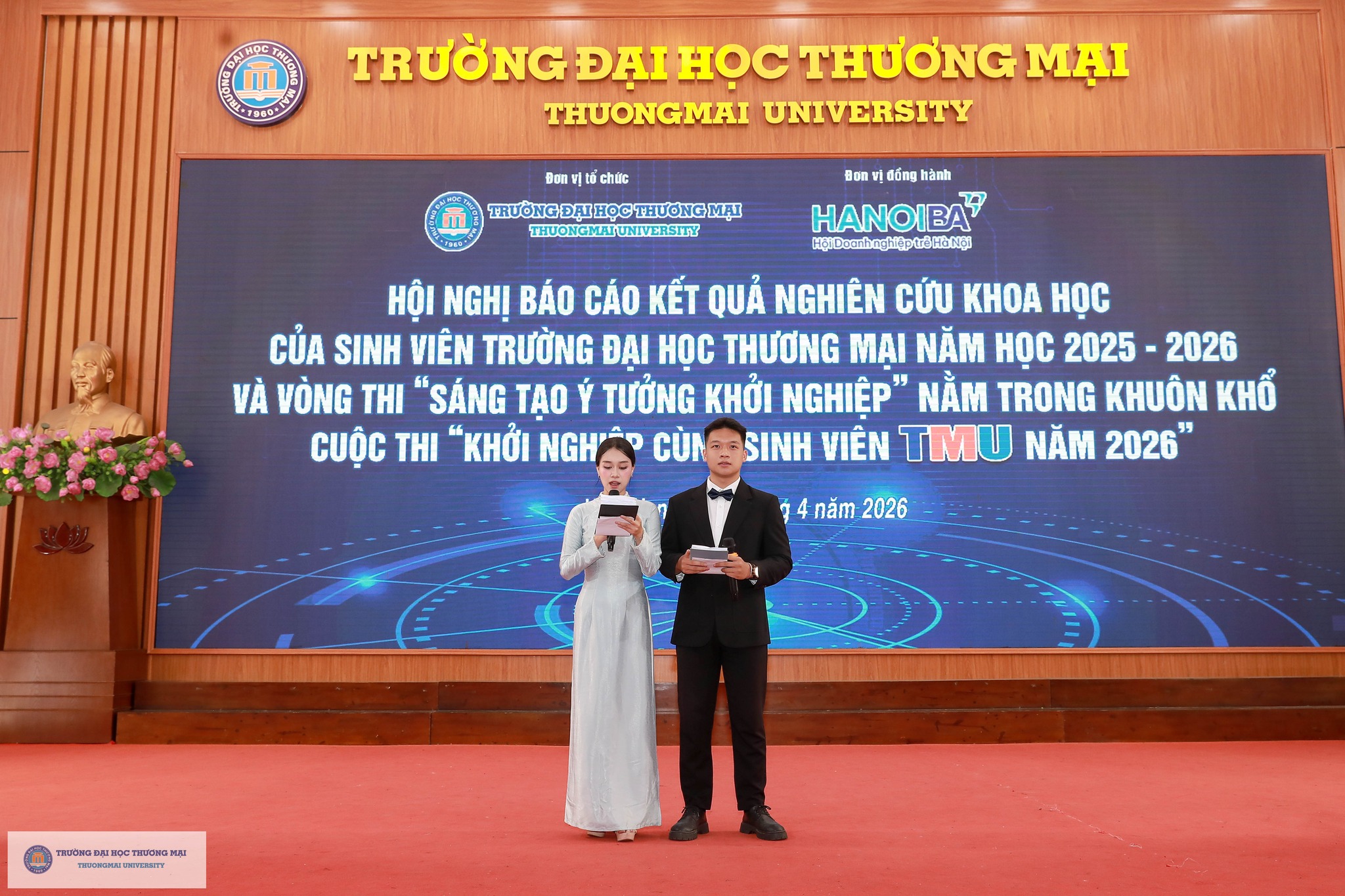 Chương trình Hội nghị báo cáo kết quả nghiên cứu khoa học và vòng thi “Sáng tạo ý tưởng khởi nghiệp” của sinh viên Trường Đại học Thương mại năm 2026 đã thành công tốt đẹp. Điều đặc biệt là, tất cả các hoạt động diễn ra song song trong chương trình đều vinh dự nhận được sự đồng hành Hội Doanh nghiệp trẻ Hà Nội (Hà Nội BA), sự hỗ trợ hết mình của các đơn vị trong Trường và Câu lạc bộ Nhà nghiên cứu trẻ của Trường Đại học Thương mại. Đây là minh chứng cho sự kết nối mạnh mẽ và vững chắc giữa Nhà trường & Doanh nghiệp; giữa Học & Hành; theo sát triết lý giáo dục của TMU: Kiến tạo tương lai (Shape the Future) - Tạo dựng môi trường giáo dục trách nhiệm, chính sách giáo dục đa dạng giúp người học trở thành những cá nhân có tư duy độc lập, sáng tạo, toàn diện cả về trí tuệ và nhân cách, có khát vọng vươn lên; khẳng định thương hiệu TMU trên nền tảng giá trị cốt lõi “Truyền thống – Trách nhiệm – Sáng tạo”.