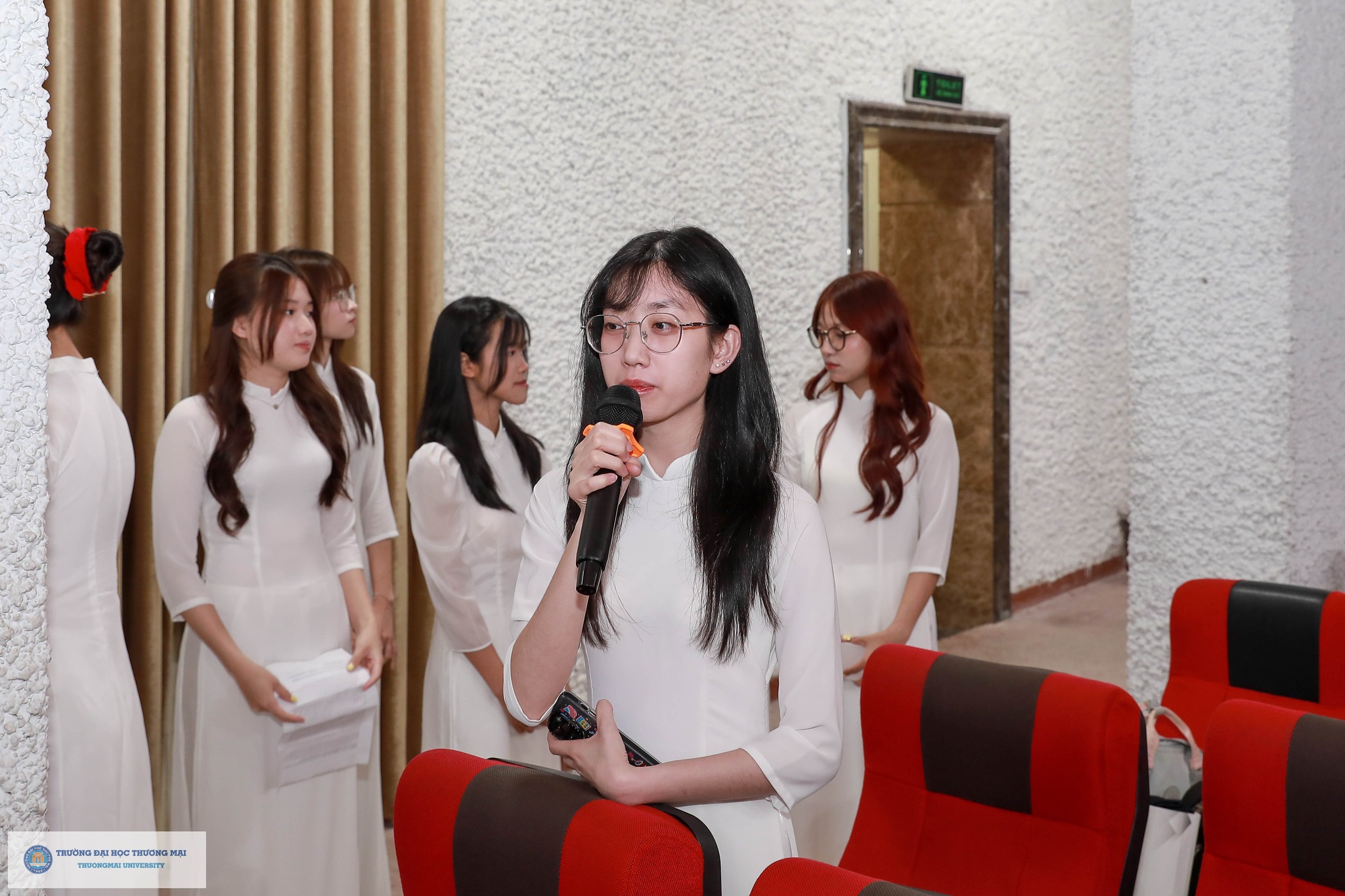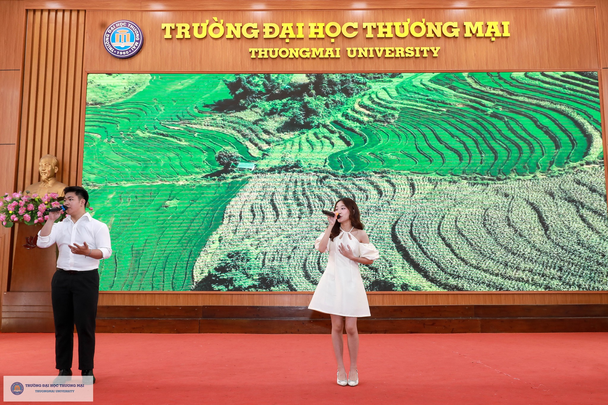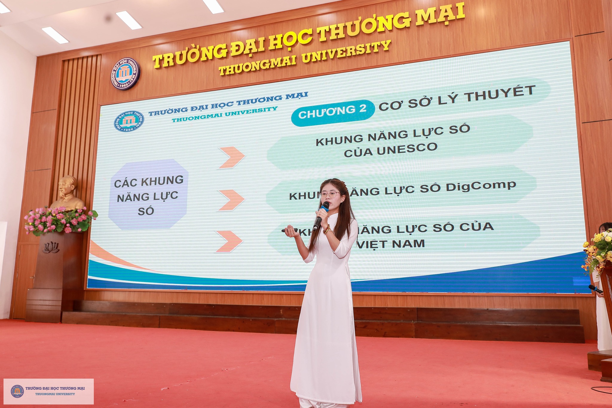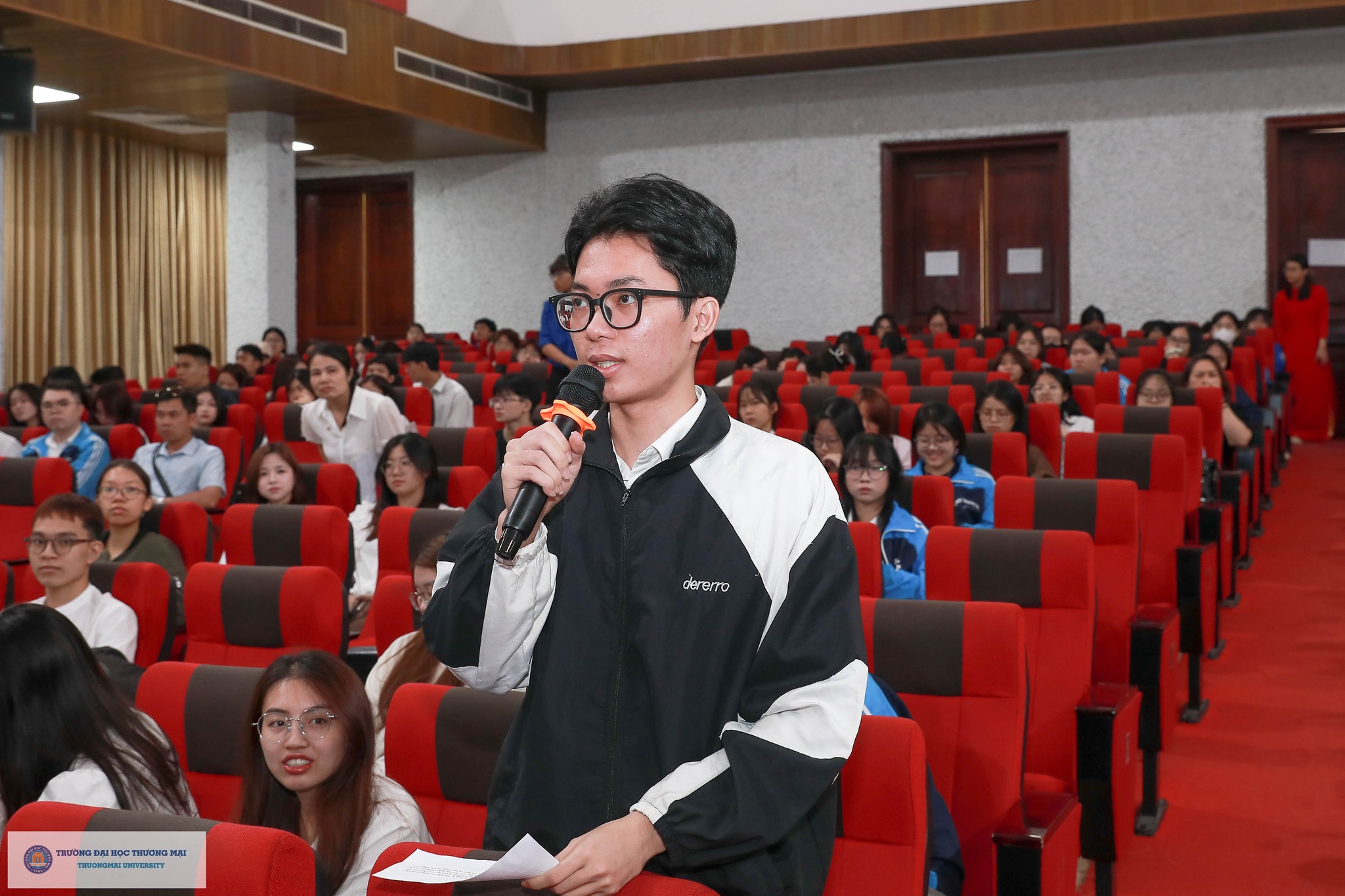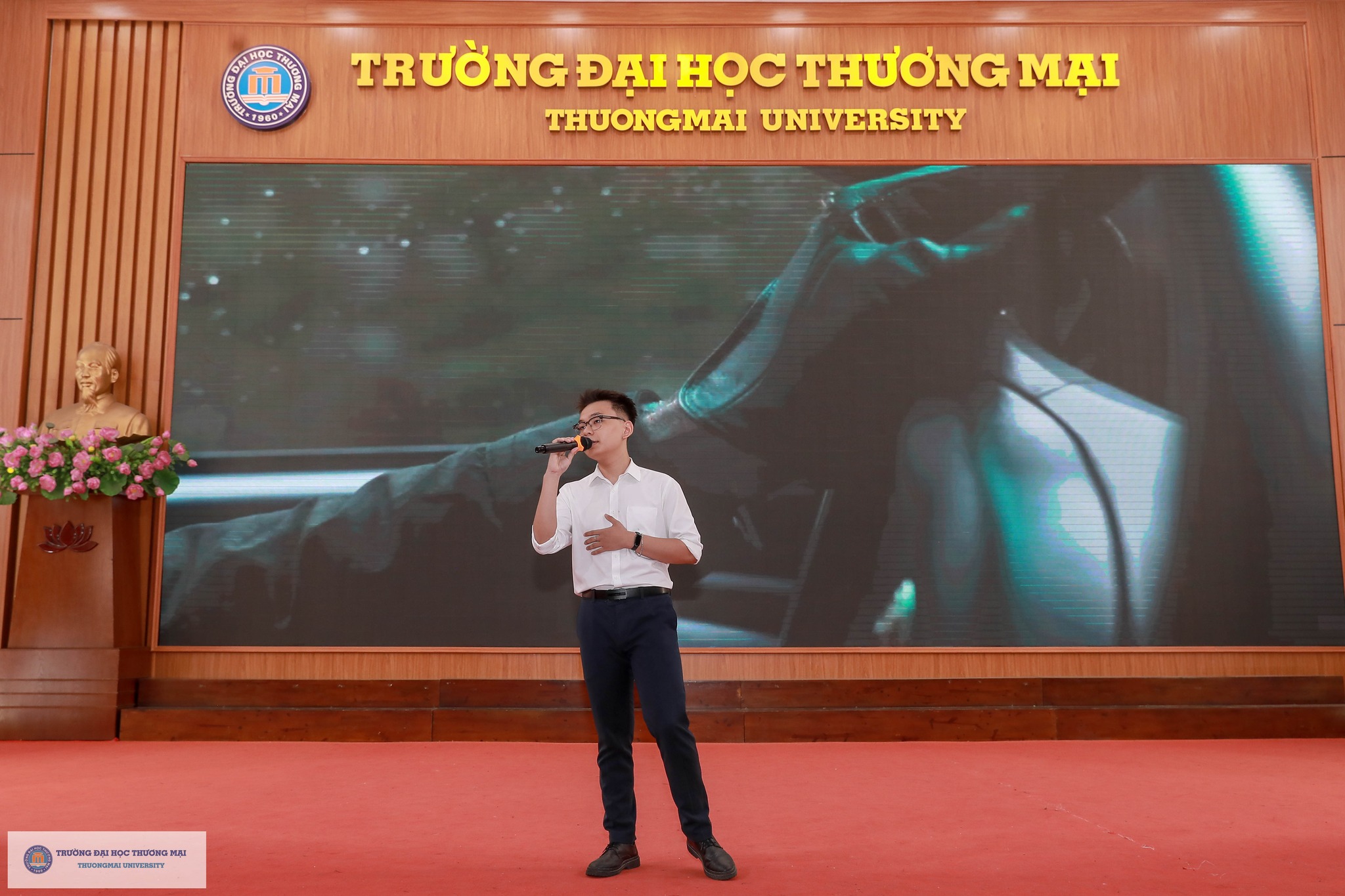 Thầy Phó Hiệu trưởng cũng ghi nhận và tôn vinh những thành tích ấn tượng của sinh viên Nhà trường trong năm học 2025 – 2026, đồng thời đại diện tập thể Lãnh đạo Nhà trường bày tỏ sự ủng hộ, khuyến khích và tin tưởng các em sinh viên – những nhà khoa học trẻ, doanh nhân trẻ, những công dân định hướng toàn cầu góp phần khẳng định thương hiệu và vị thế của Trường Đại học Thương mại trong khu vực và thế giới.