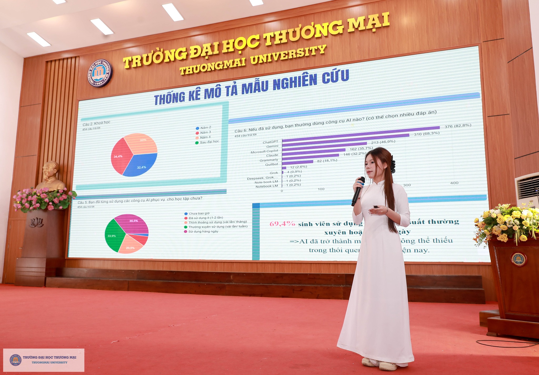 Nhóm sinh viên đến từ Viện Quản trị kinh doanh với đề tài: “Tác động của trí tuệ nhân tạo đến phúc lợi, lo sợ bất ổn trong công việc và hành vi học tập về AI của người lao động. Nghiên cứu điển hình tại Hà Nội”.