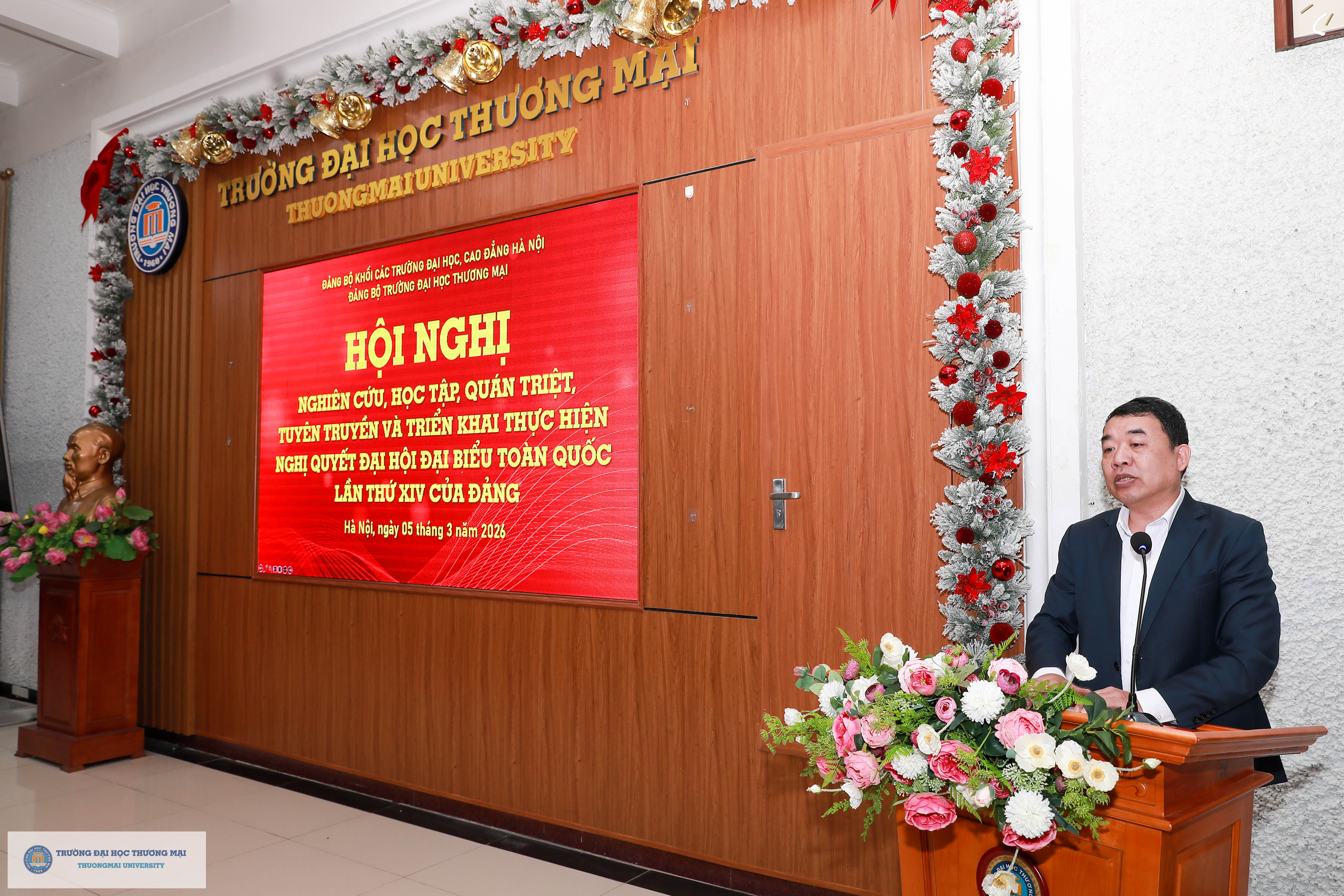 Tiếp tục nghiên cứu sâu sắc, cập nhật đầy đủ nội dung mới Nghị quyết Đại hội XIV của Đảng (được tiếp sóng trực tiếp trong Hội nghị từ Hội trường Diên Hồng, Nhà Quốc hội và kết hợp trực tuyến tới 31.097 điểm cầu ở Trung ương, các tỉnh, thành phố, các xã, phường, đặc khu, các tổ chức đảng trong Quân đội, Công an và doanh nghiệp với hơn 1,9 triệu đại biểu tham dự tại các điểm cầu, ngày 07/02/2026), ngày 05/3/2026, Đảng ủy Trường Đại học Thương mại đã tổ chức Hội nghị nghiên cứu, học tập, quán triệt, tuyên truyền và triển khai thực hiện Nghị Quyết Đại hội đại biểu toàn quốc lần thứ XIV của Đảng tại Trường Đại học Thương mại cho các đồng chí đảng viên các chi bộ chưa tham dự học ngày 07/02/2026.