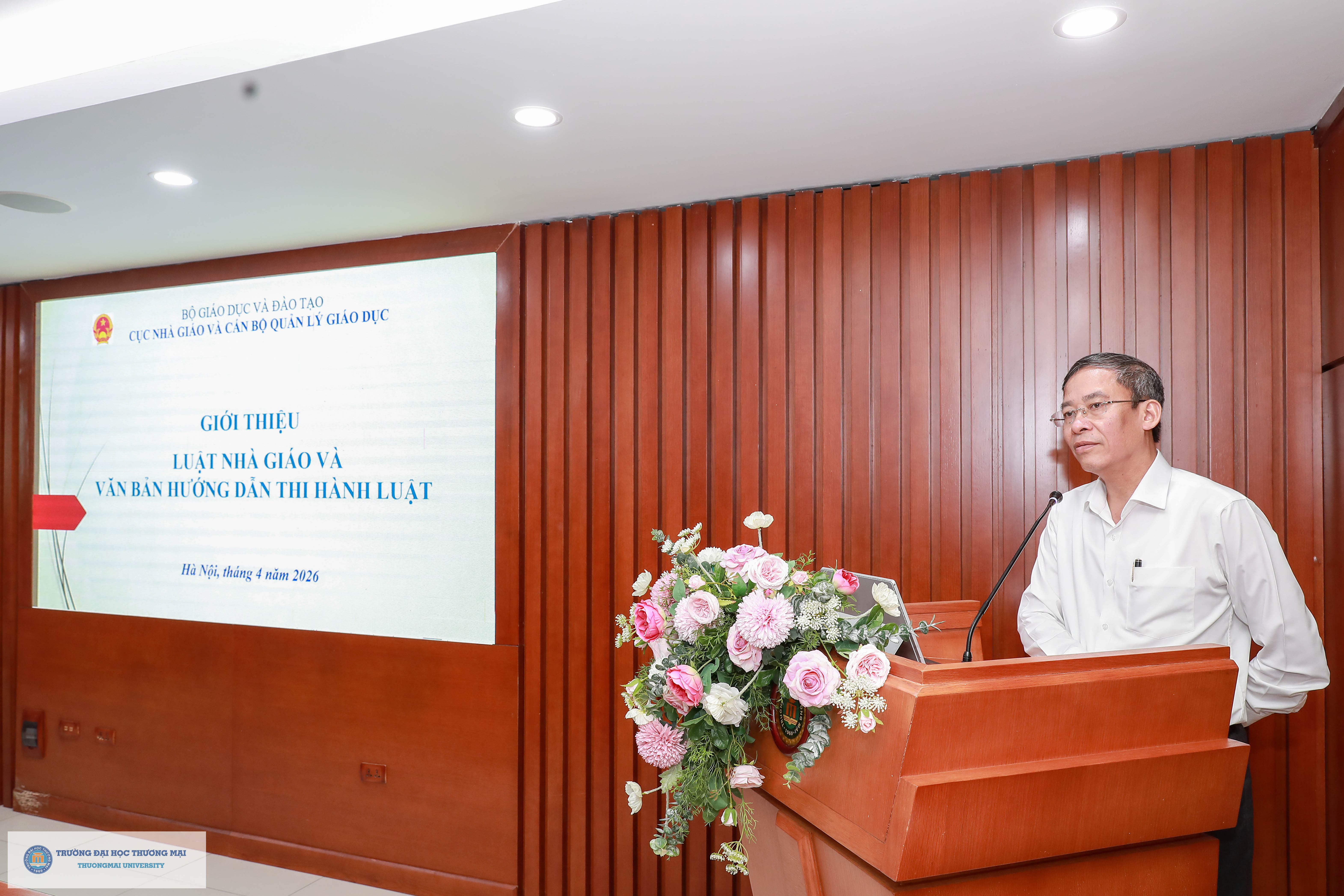 Tại Hội nghị, TS. Vũ Minh Đức - Cục trưởng Cục Nhà giáo và Cán bộ quản lý giáo dục, Bộ Giáo dục và Đào tạo đã báo cáo chuyên đề về Tuyên truyền, phổ biến Luật Nhà giáo năm 2025 và các chính sách nhà giáo đại học theo Nghị định số 93/2026/NĐ-CP ngày 31/3/2026.