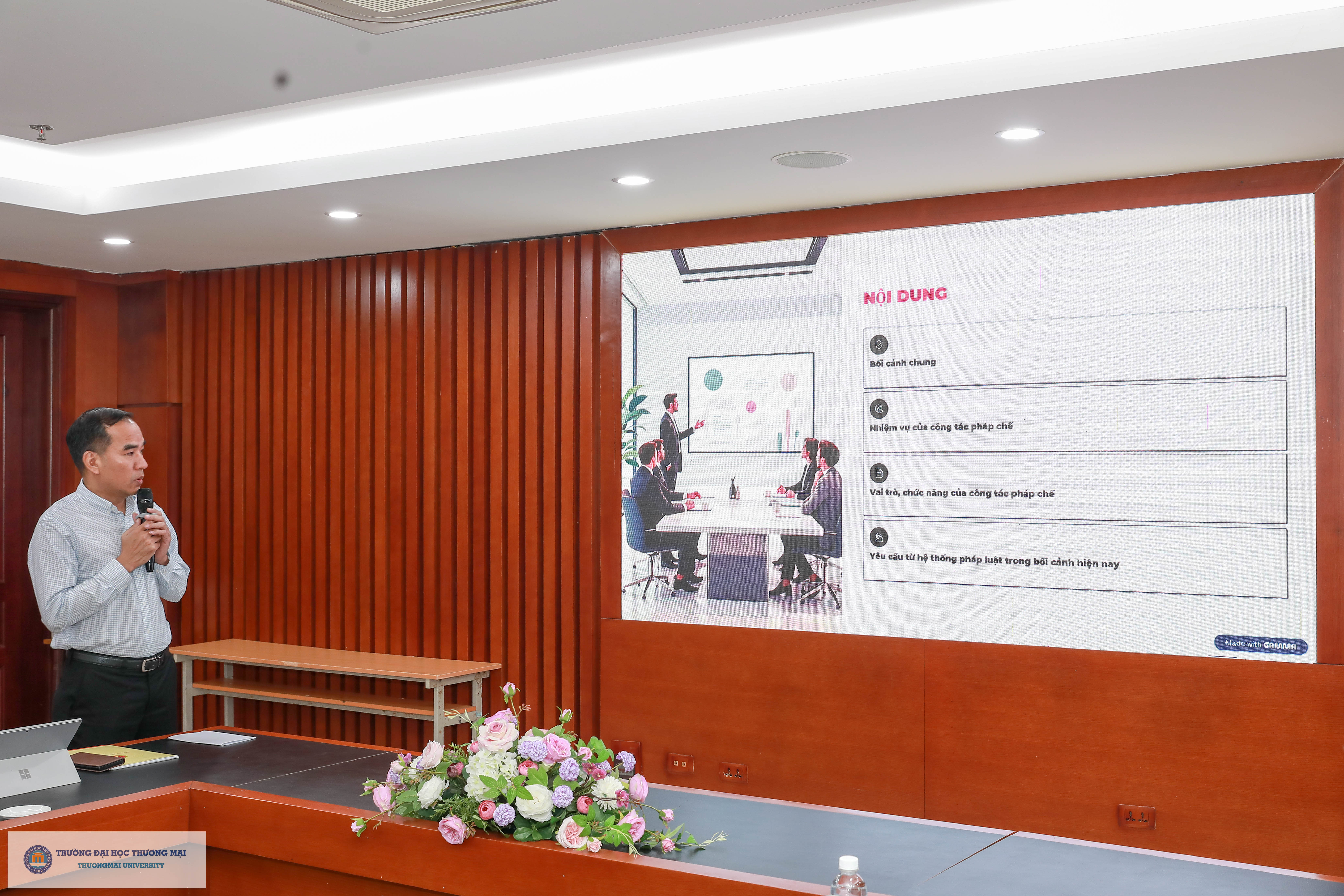 TS. Đào Hồng Cường – Phó Vụ trưởng Vụ Pháp chế, Bộ Giáo dục và Đào tạo báo cáo chuyên đề về Một số lưu ý về công tác pháp chế trong cơ sở giáo dục đại học trong bối cảnh hiện nay.