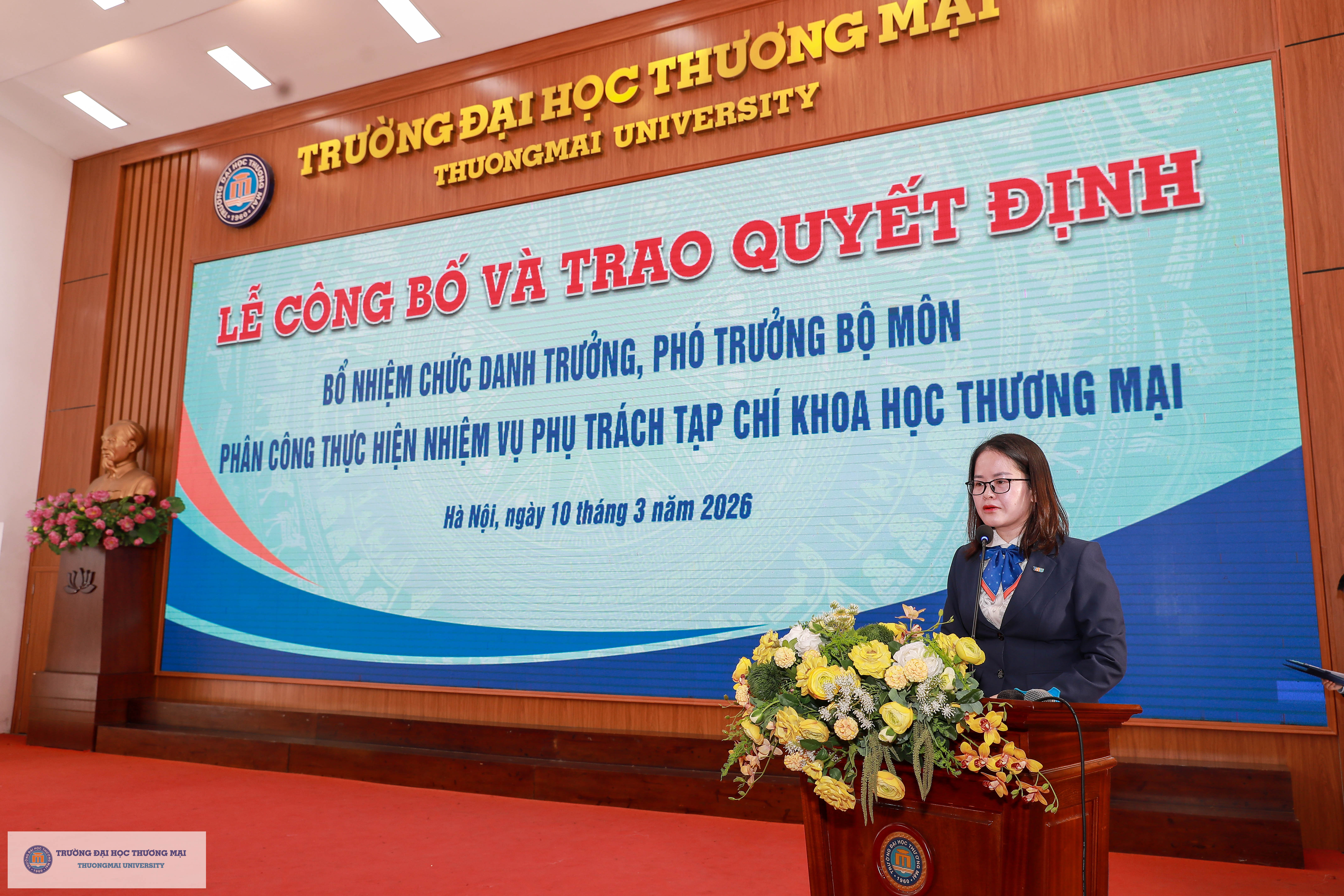 Tại buổi Lễ, PGS,TS. Mai Thanh Lan – Trưởng phòng Tổ chức nhân sự đã thừa ủy quyền của PGS,TS. Nguyễn Hoàng – Phó Bí thư Đảng ủy, Hiệu trưởng Nhà trường công bố các Quyết định về việc bổ nhiệm và giao nhiệm vụ phụ trách đối với viên chức quản lý các đơn vị: Viện Quản trị kinh doanh, Viện Kế toán – Kiểm toán, Tạp chí Khoa học Thương mại.