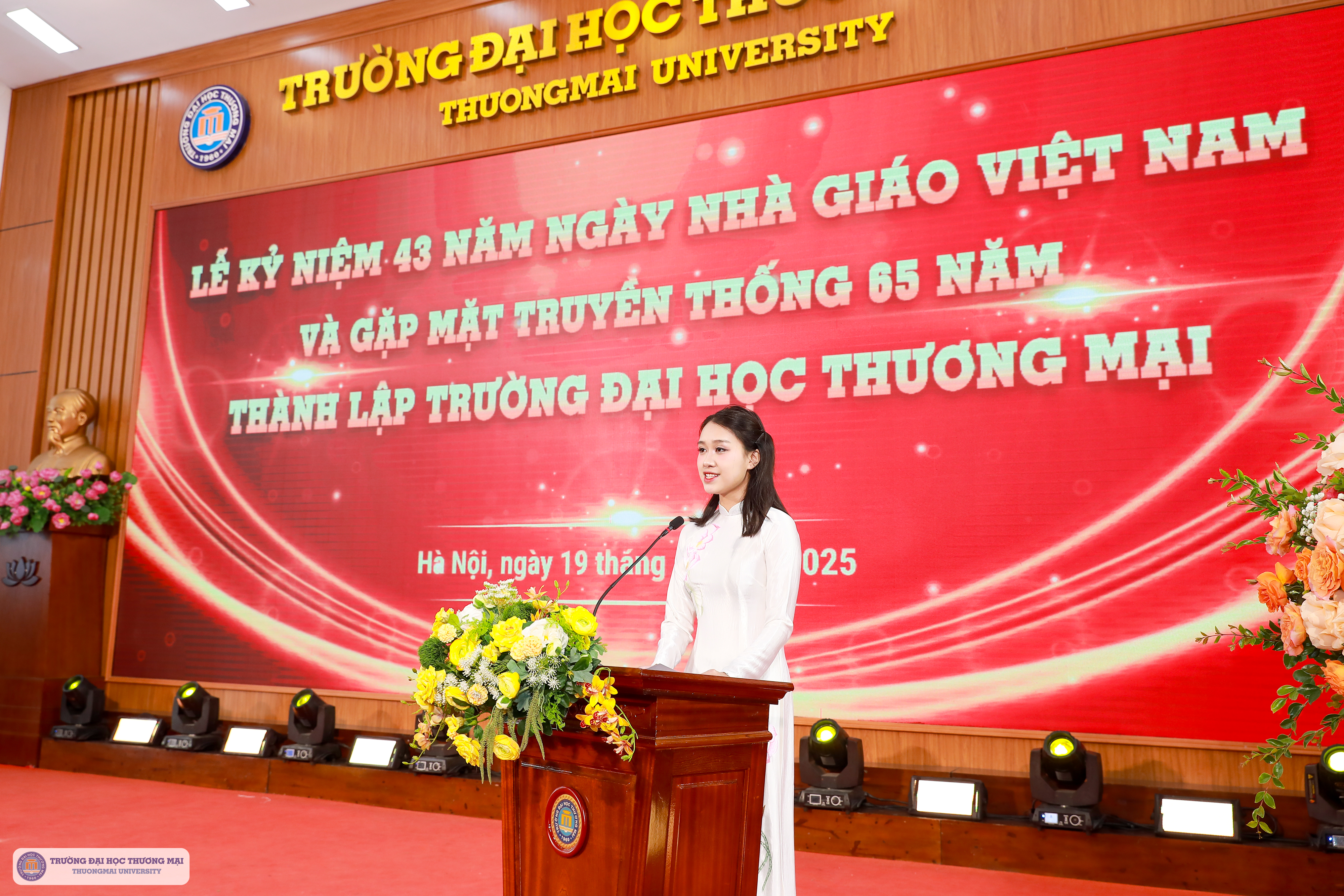 Đặc biệt, PGS,TS. Nguyễn Hoàng gửi lời cảm ơn chân thành tới các thế hệ người học TMU. Thầy hiệu trưởng nhấn mạnh, trong suốt hành trình 65 năm qua, dù ở đâu, làm gì, mỗi dấu ấn thành công của các thế hệ sinh viên, học viên,… dưới mái trường Thương mại đều đã góp phần làm rạng danh TMU, để tên tuổi Trường Đại học Thương mại ngày một vang xa hơn, đẹp hơn trong lòng xã hội.