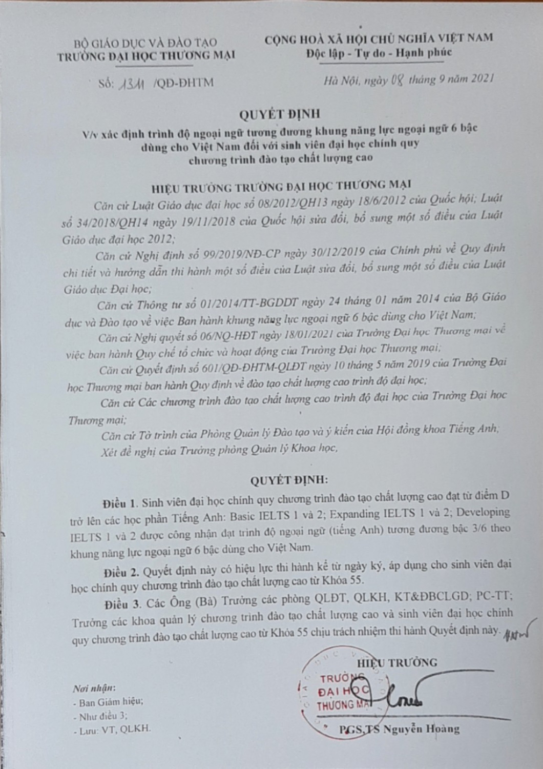Quyết định về việc xác định trình độ ngoại ngữ tương đương khung năng lực ngoại ngữ 6 bậc dùng cho Việt Nam đối với sinh viên đại học chính quy chương trình đào tạo chất lượng cao